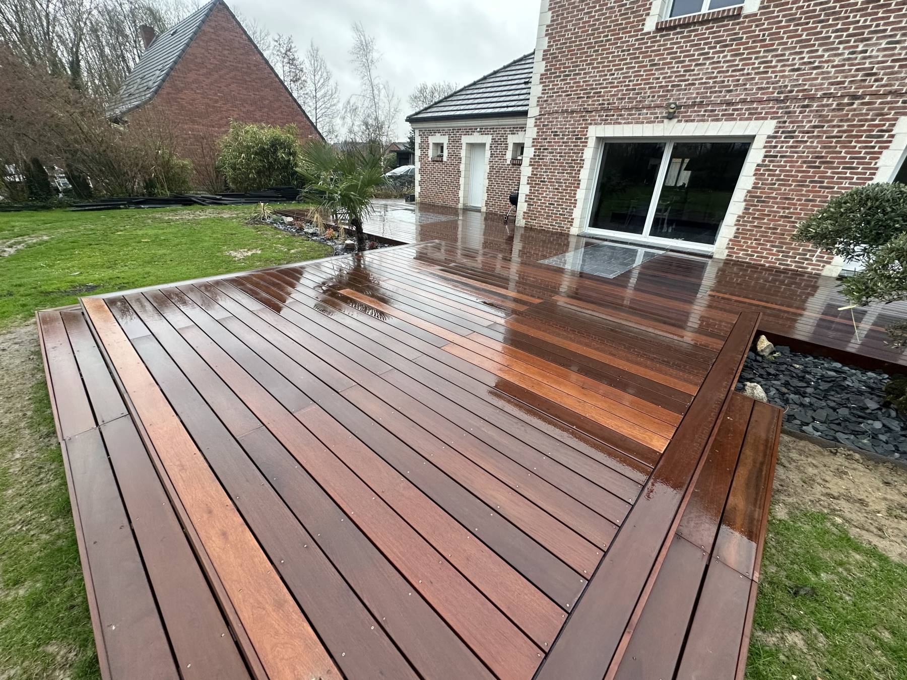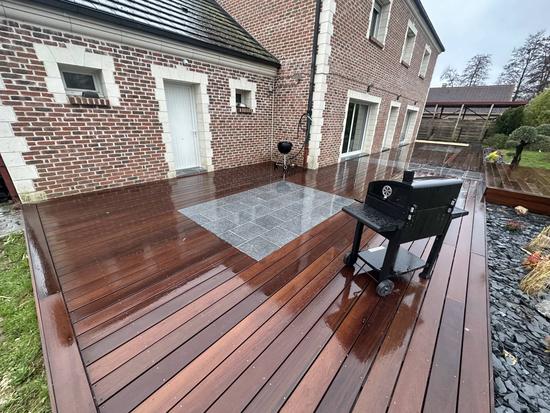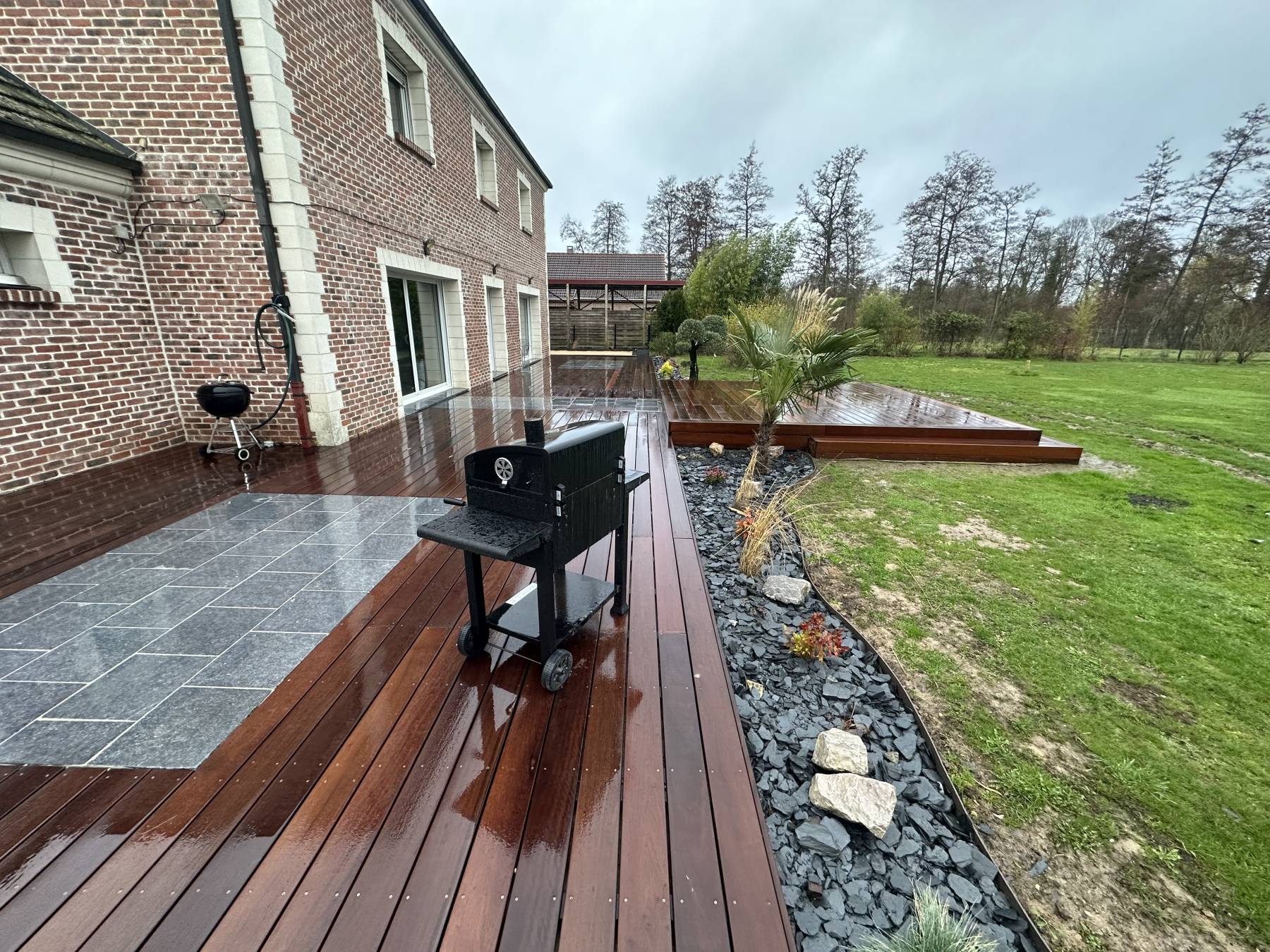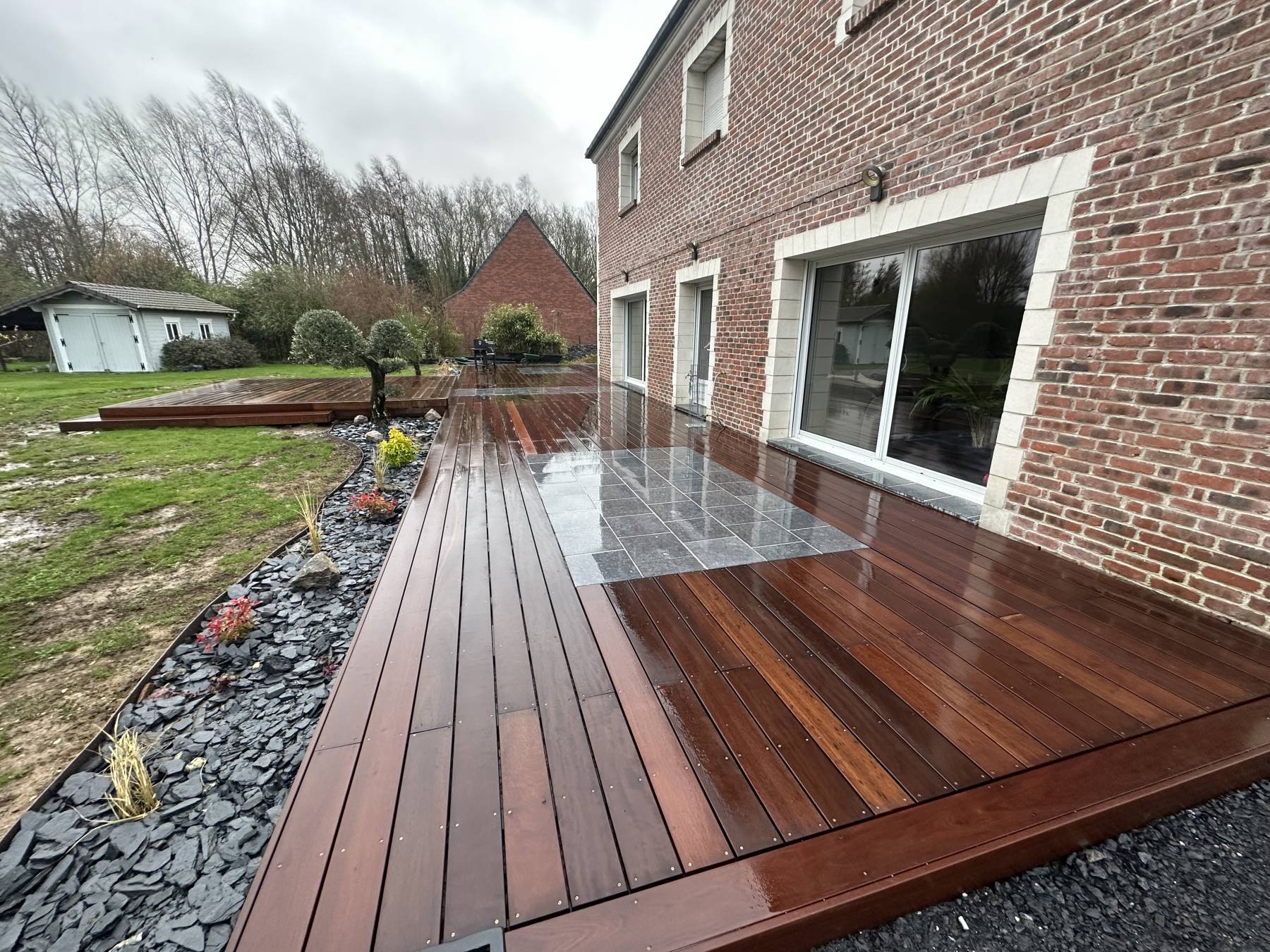 Terrasse bois exotique / pierre bleu de Soignies / plantation / terrain de pétanque