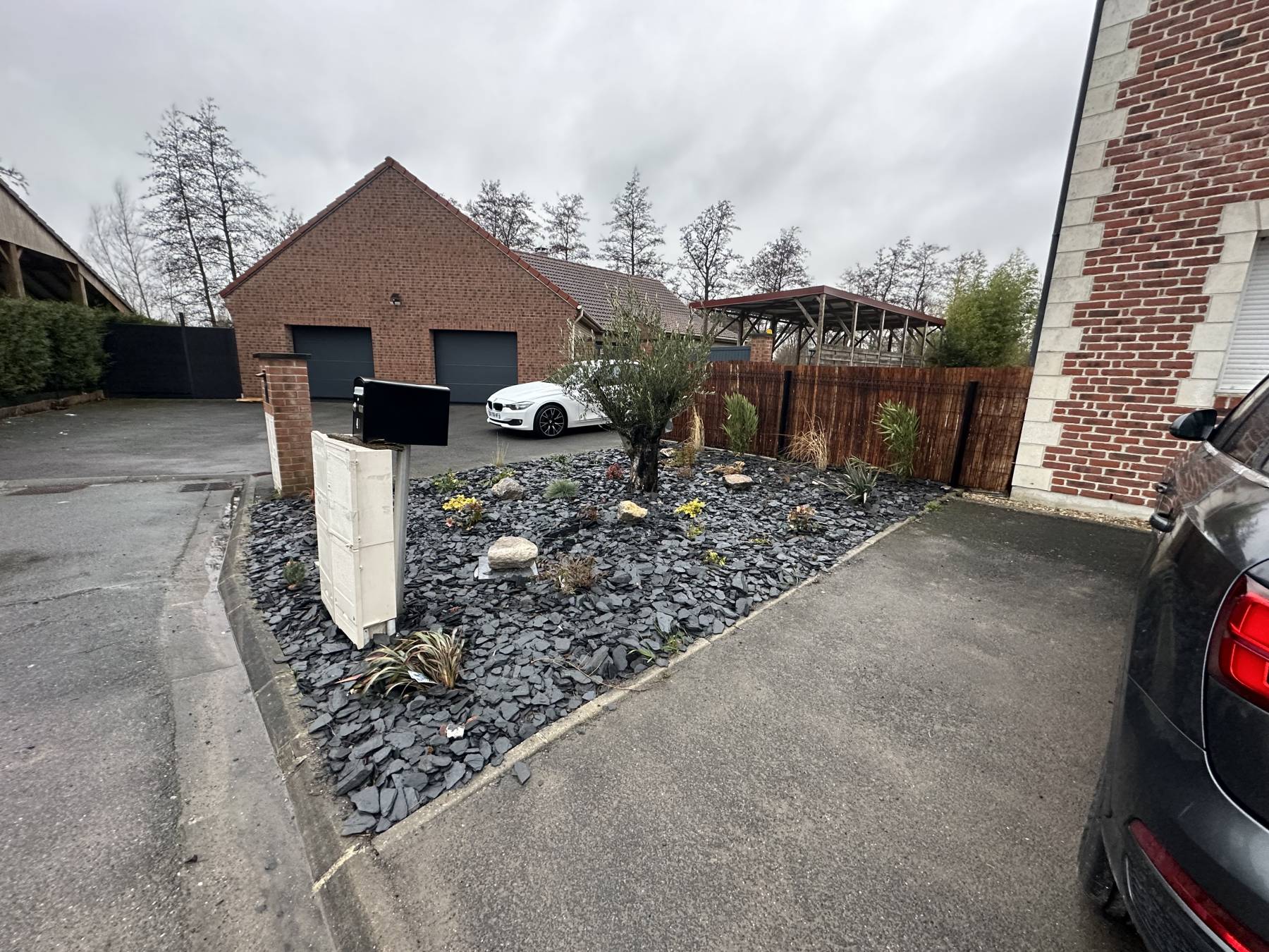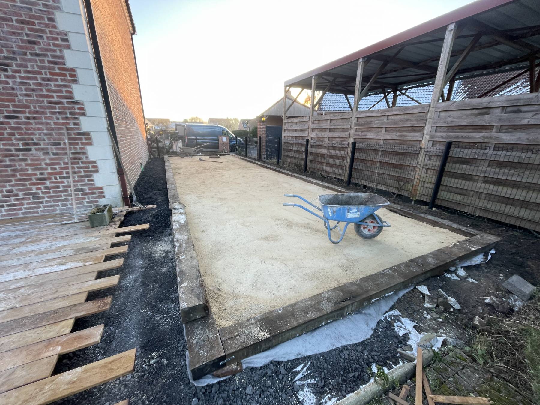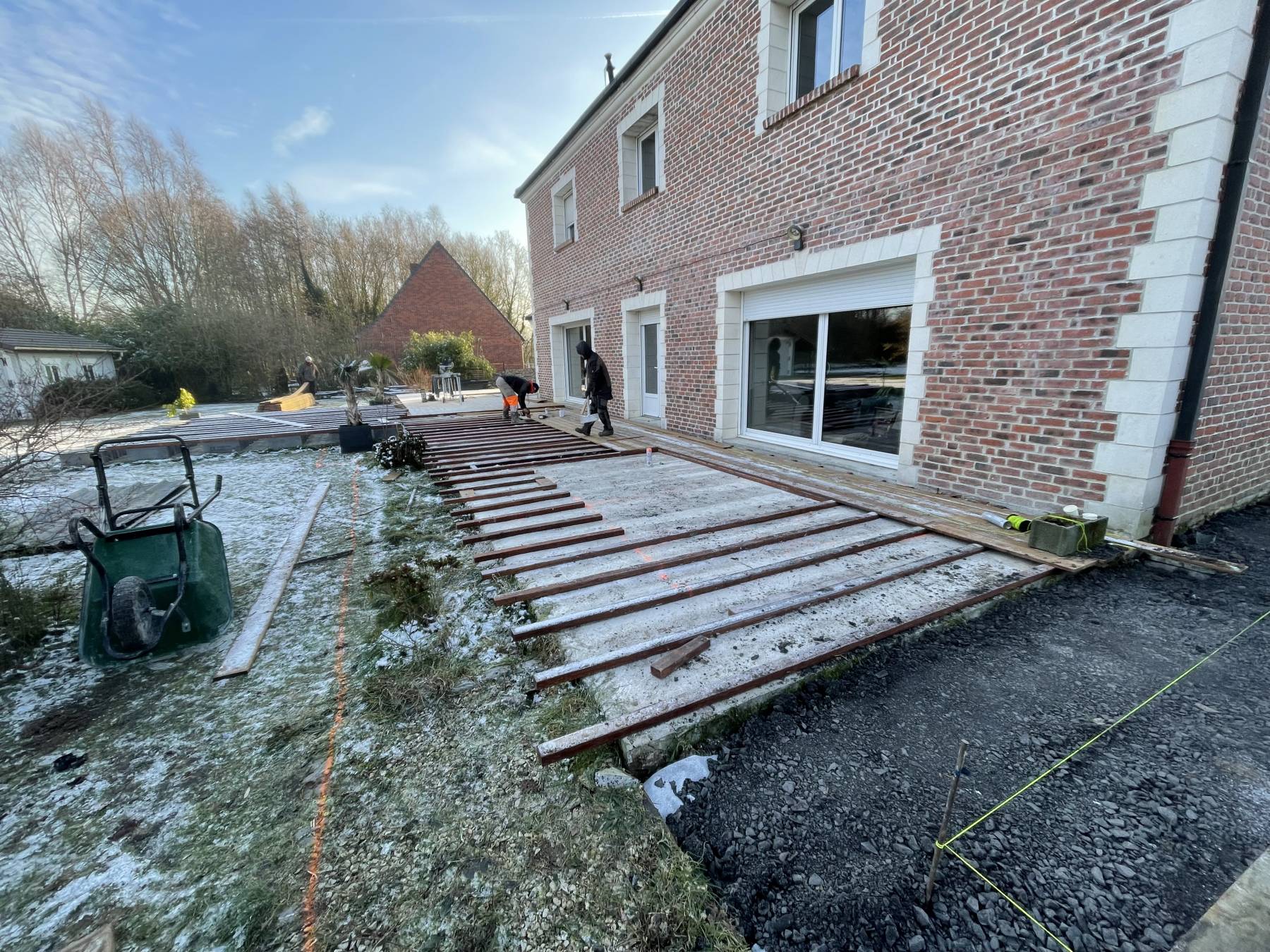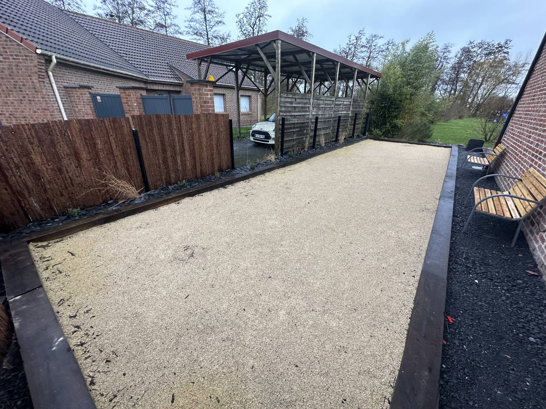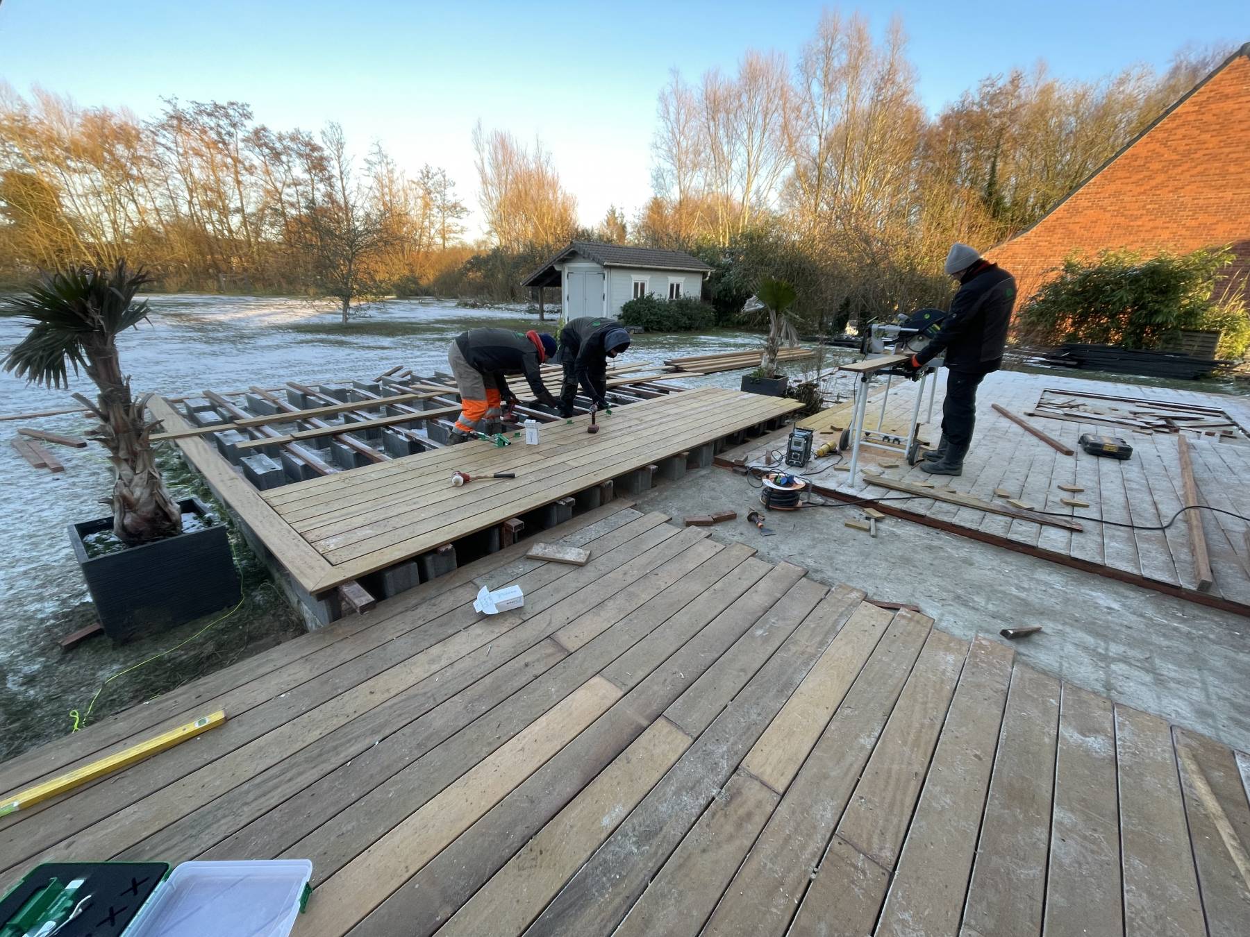 Terrasse bois exotique / pierre bleu de Soignies / plantation / terrain de pétanque
