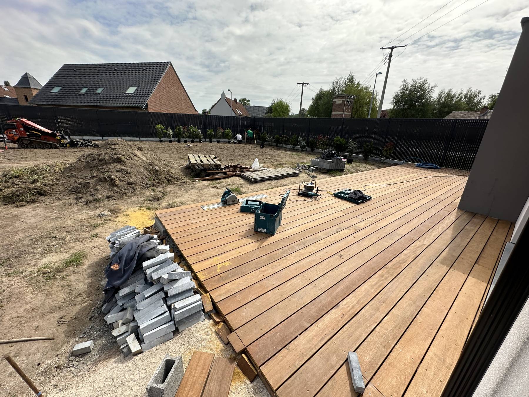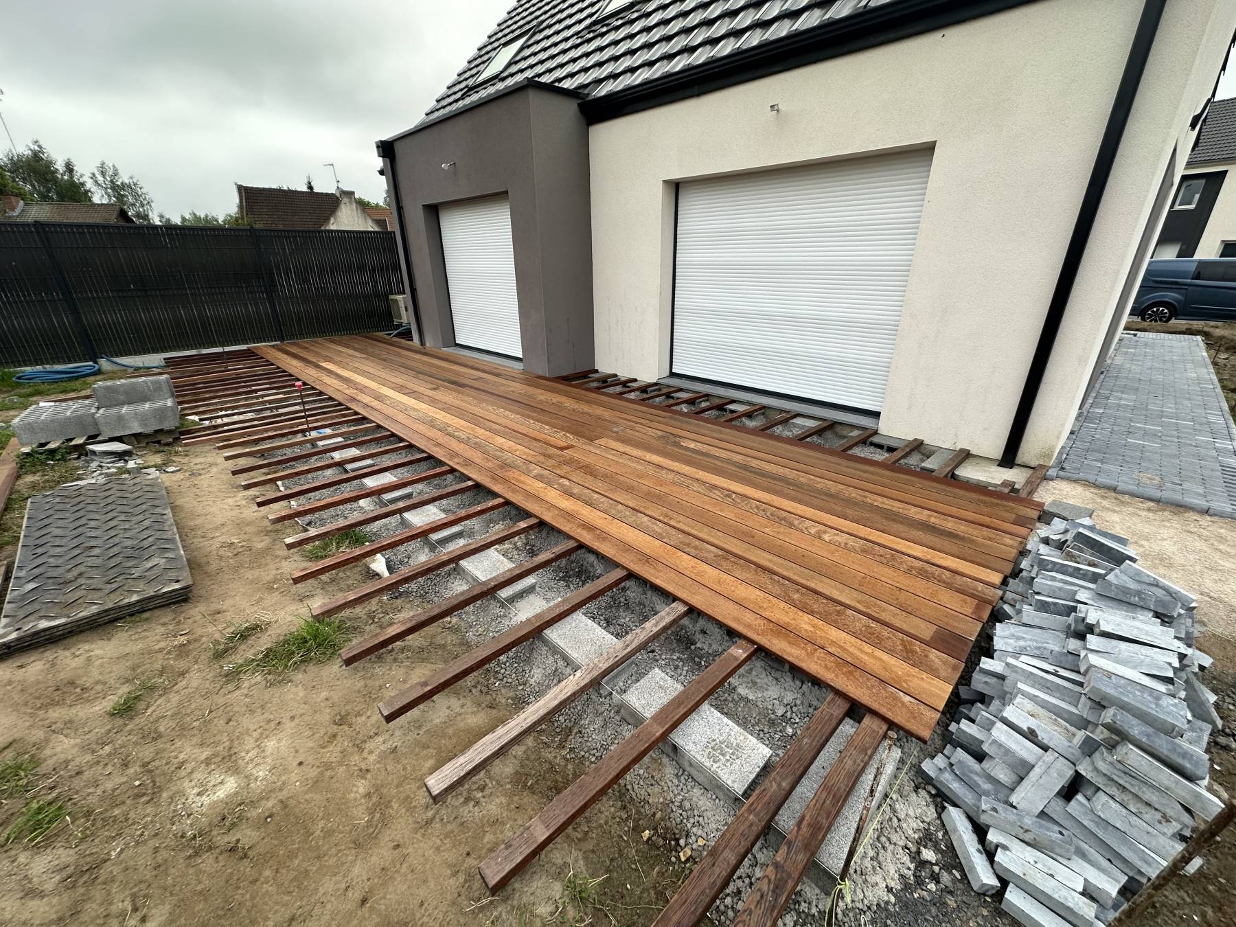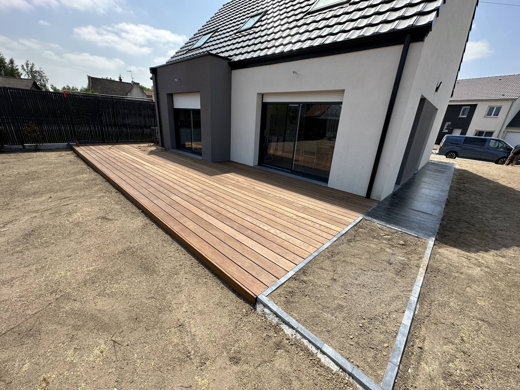 Terrasse bois exotique / allée en enrobé / pavage / dalle de béton / plantation / gazon