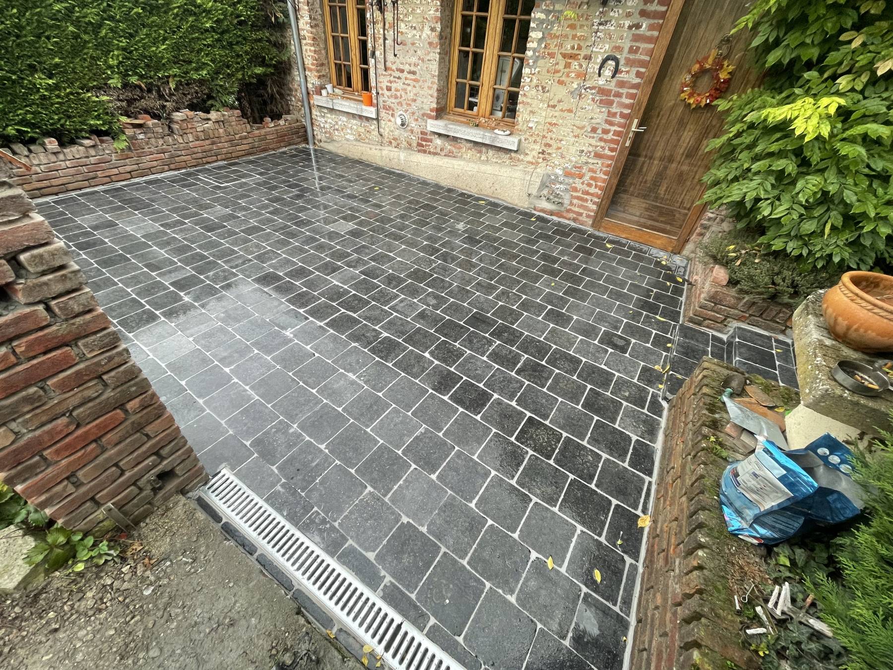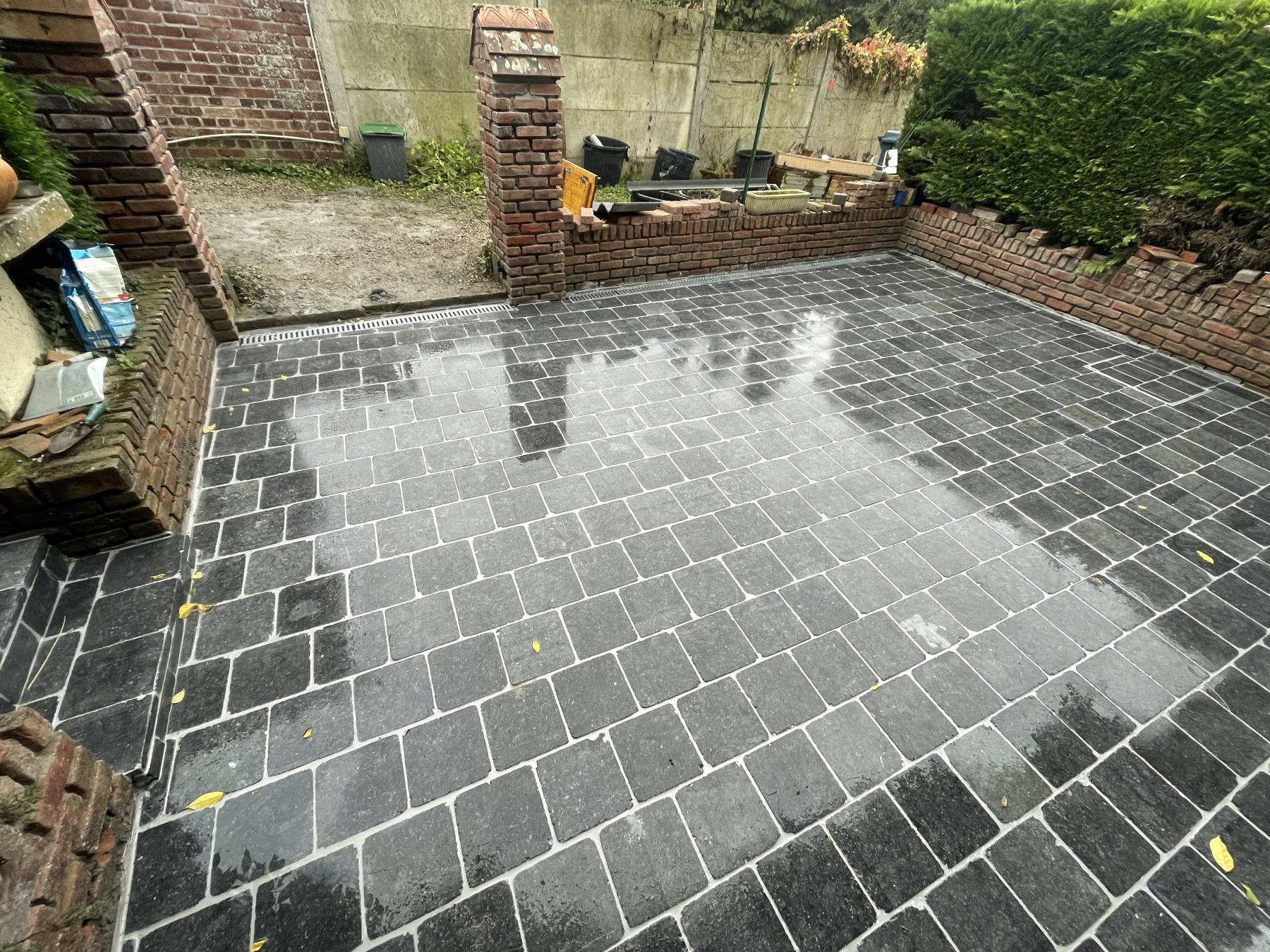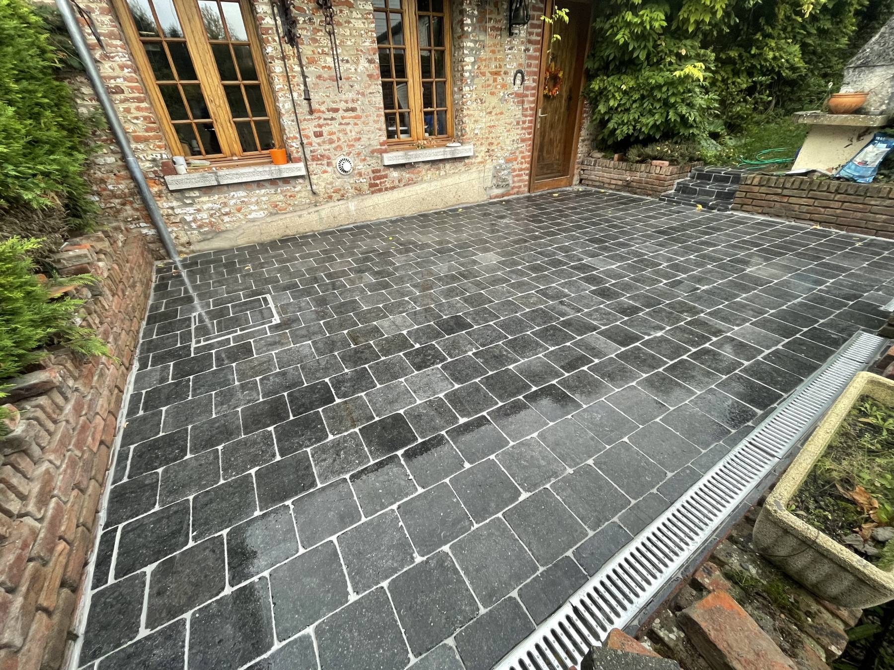 Création d’une terrasse en pierre bleu à Sebourg (59)